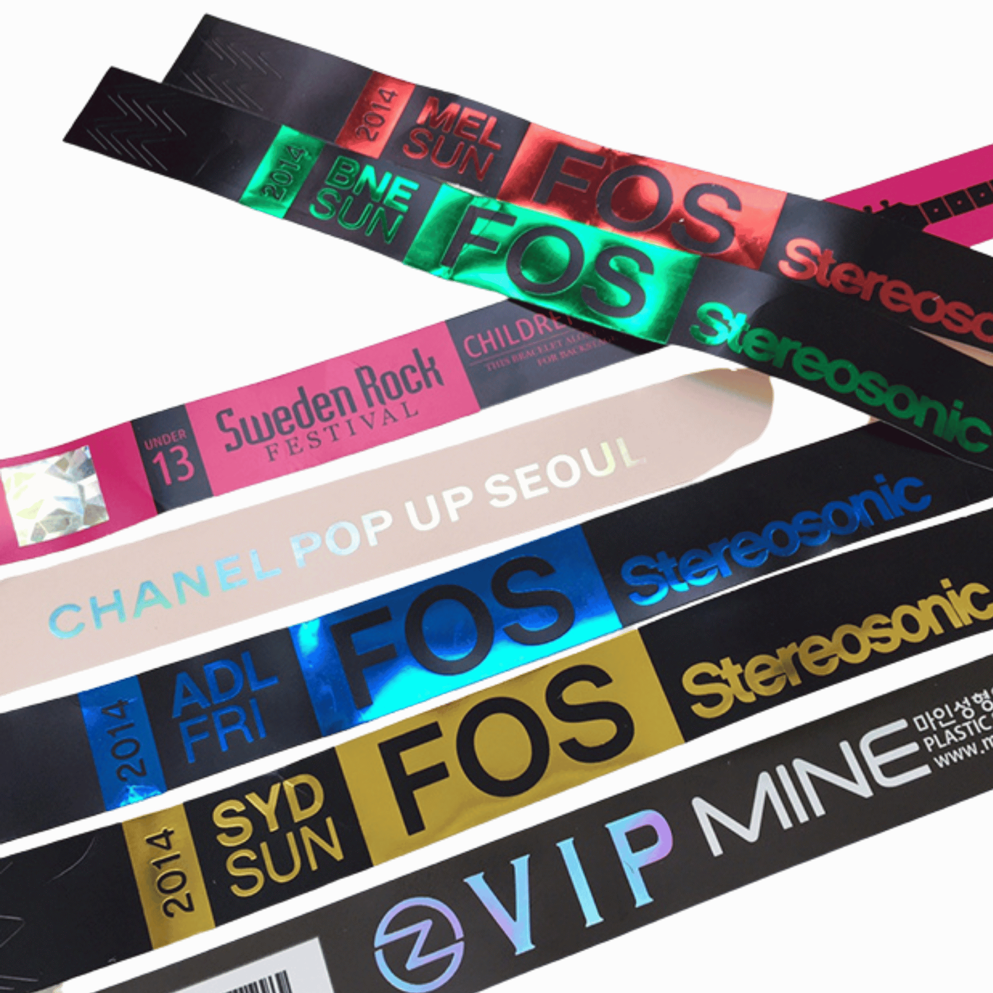 Elevate your event’s branding with our Custom Foil & Holographic Wristbands. Manufactured using high-grade YUPO synthetic paper, these bands offer a premium alternative to standard Tyvek, featuring a milky-white surface that ensures colors appear vibrant and true to design.