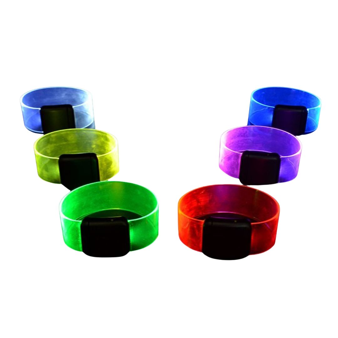 This model is a classic attention-grabber. It features a colored strap (fuchsia, green, blue, etc.) and a bright LED that illuminates the entire band. A discreet on/off switch allows the user to control the flashing, making it a perfect interactive accessory for parties and concerts.