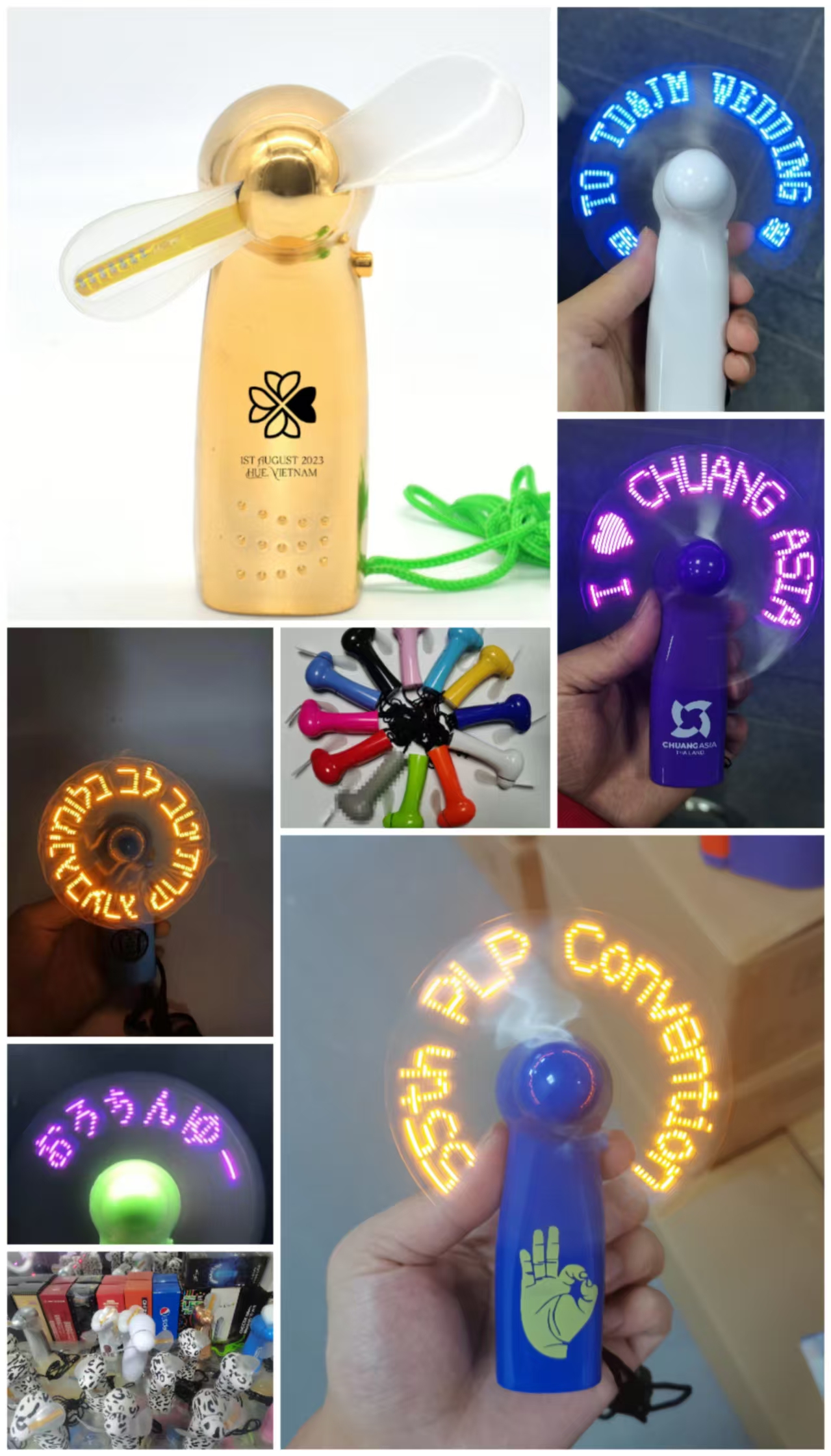 Available in various fabric colors (including classic white for weddings) and LED colors, they can be branded to match your event theme seamlessly. Whether used for a massive rave or an intimate wedding reception, these fans ensure your brand or message shines bright in the dark.