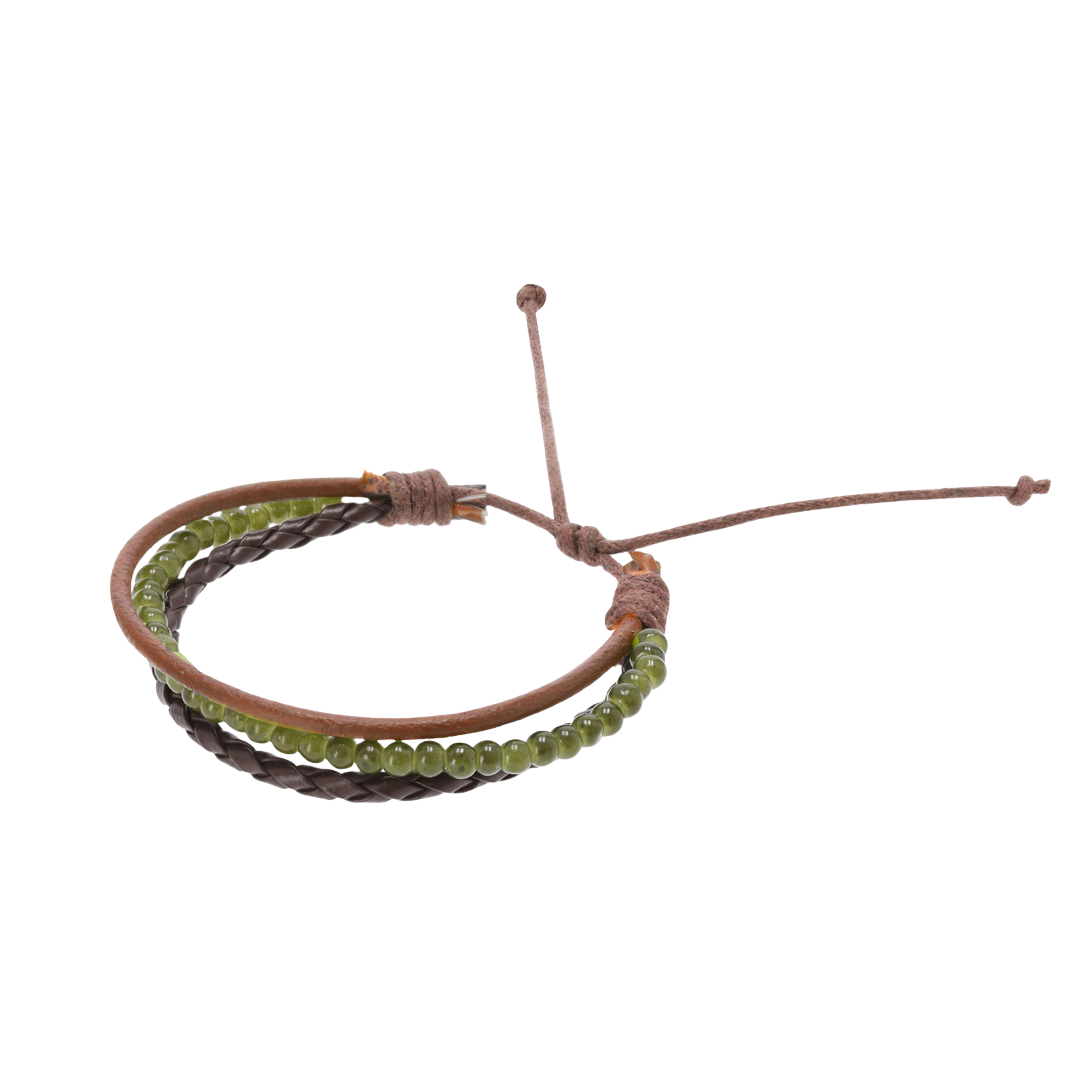 Distinctive Trio Design: The wristband combines a smooth light brown leather strip, a textured braided dark brown leather cord, and a center strand adorned with light green glass beads.